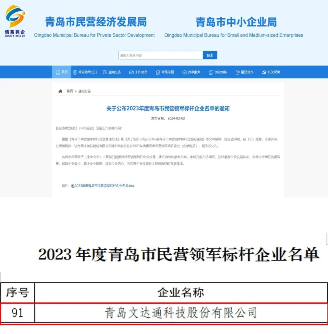 近日,山东省市场监督管理局和青岛市民营经济(中小企业)发展工作领导小组办公室分别发布了2023年度“山东省高端品牌培育企业”和“青岛市民营领军标杆企业名单”,文达通股份凭借卓越的产品力、科技力和企业影响力,荣膺2023年度“山东省高端品牌培育企业”“青岛市民营领军标杆企业”称号。